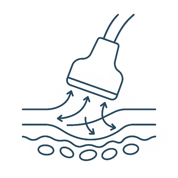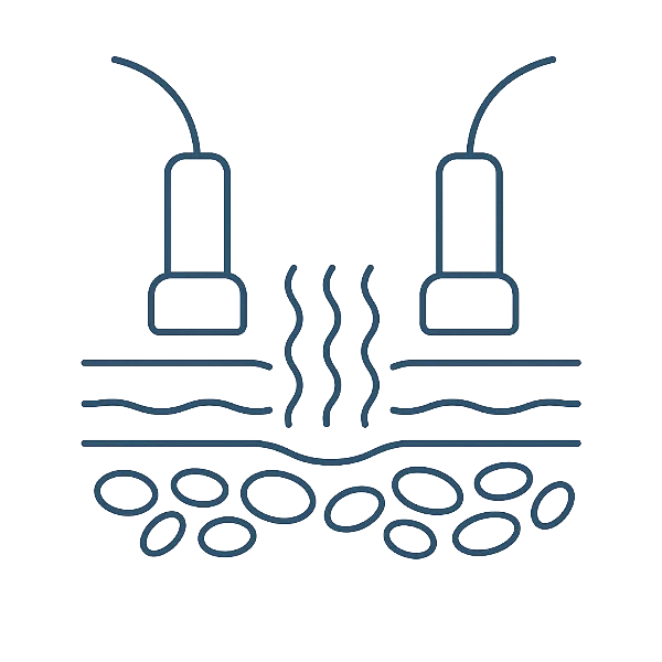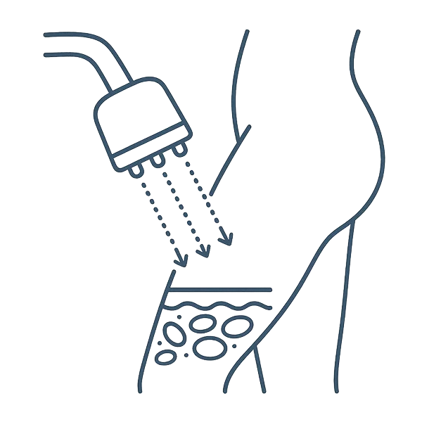 You lie back while the device works on your target areas, abdomen, thighs, arms, hips, or face. It feels like a warm deep-tissue massage. Sessions run 20–60 minutes.